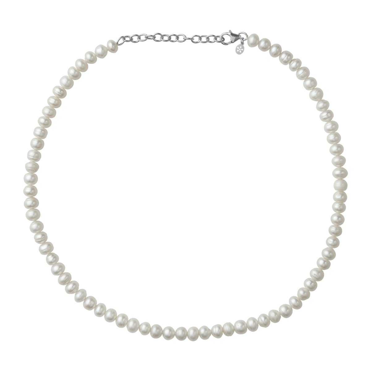 Pearl Necklace er et tidløst halskjede som utstråler naturlig skjønnhet med sitt elegante design. Halskjedet er laget av ferskvannsperler som alle har samme størrelse, men hver perle har sin egen unike, naturlige form. Det ensartede, men likevel varierte uttrykket gir halskjedet en vakker sjarm som fremhever perlenes individuelle skjønnhet.