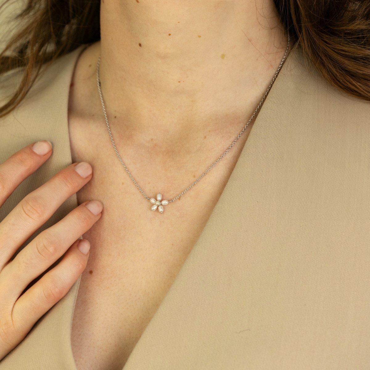 Pearl Signature Necklace er et vakkert og enkelt halskjede som fanger blikket med sitt unike design. I midten av halskjedet er det en blomst laget av ferskvannsperler som tilfører smykket en naturlig eleganse. De fine perlene fanger lyset på en måte som gir halskjedet en lysende og glamorøs effekt, perfekt både til hverdags og til spesielle anledninger.