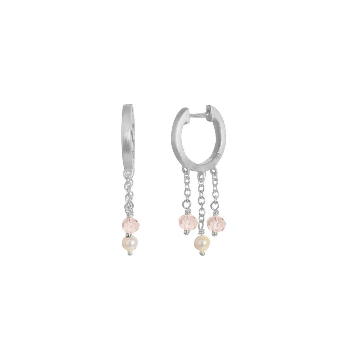 De to kortere kæder afsluttes med en lyserøde krystal, som tilføjer et diskret pop af farve og en sofistikeret glans. Den længere kæde er prydet med en elegant ferskvandsperle, der tilfører et naturligt og luksuriøst touch. Denne kombination af krystal og perle skaber en harmonisk balance mellem moderne stil og klassisk skønhed.