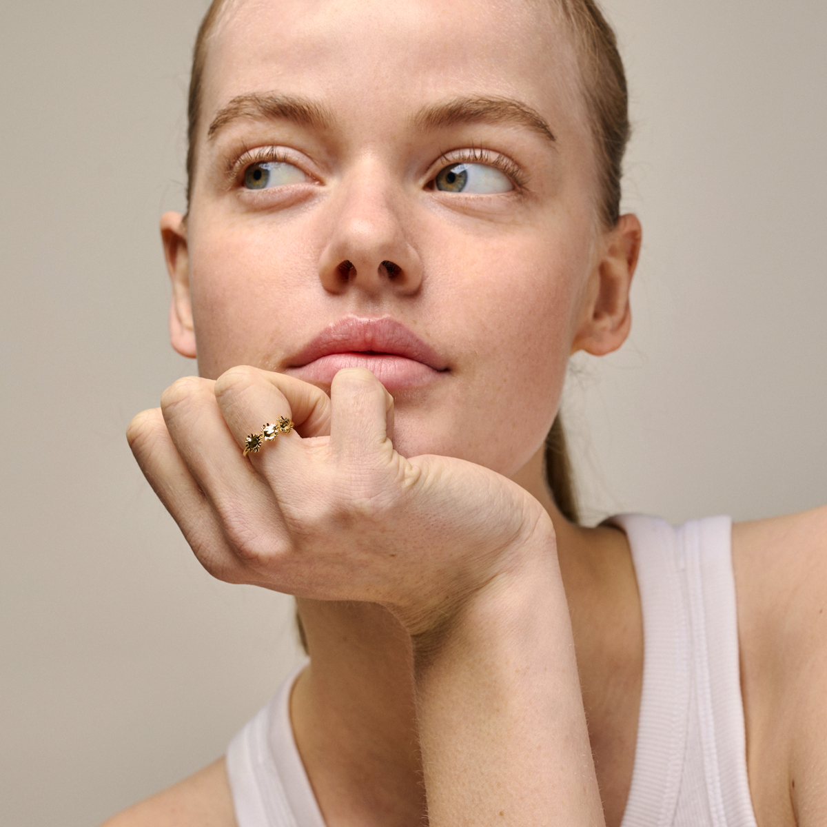 Denne delikate solsikkeringen fra ENAMEL Copenhagen minner om barndommens somre da blomsterkransene ble flettet under åpen himmel. Ringen består av tre små solsikker på rekke og rad - et søtt og poetisk design som kombinerer nostalgi med moderne enkelhet. Det subtile uttrykket gjør ringen enkel å style til både hverdag og fest, og den unike formen gir et personlig preg uten å forstyrre resten av looken din. En ideell gave til noen som bringer solskinn og glede inn i livet ditt - eller som en kjærlig påminnelse til deg selv.