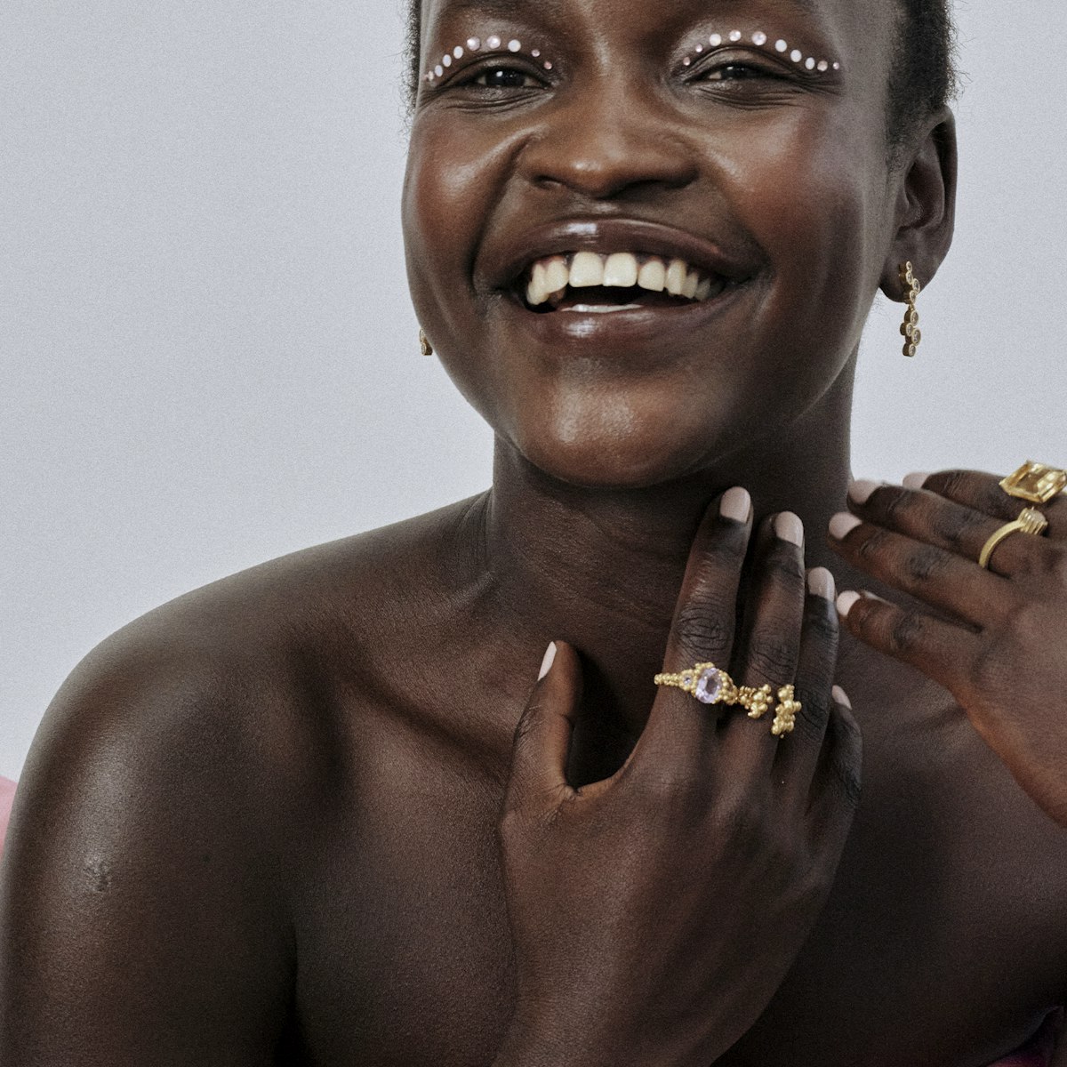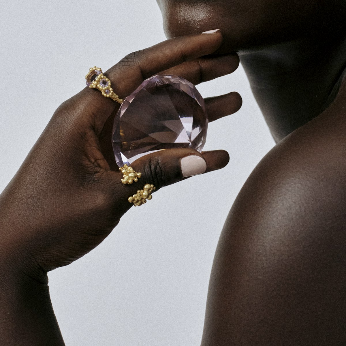 I en strøm av boblende abstraksjon skjuler Moonlit Secret Ring fire rosa ametyster som et ekstraordinært midtpunkt. Denne ringen er rå, elegant og helt unik!