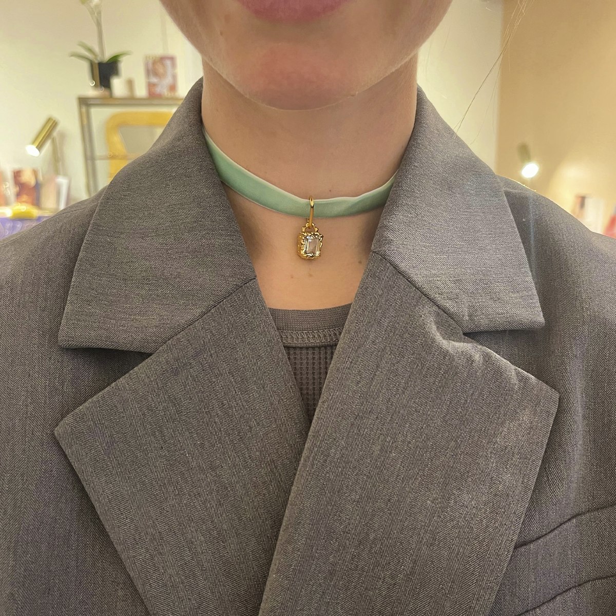 Dette er en vakker og iøynefallende choker fra merket House of Vincent. Den er laget av velur og er utsmykket med en fin, grønn ametyst som henger ned fra smykket.