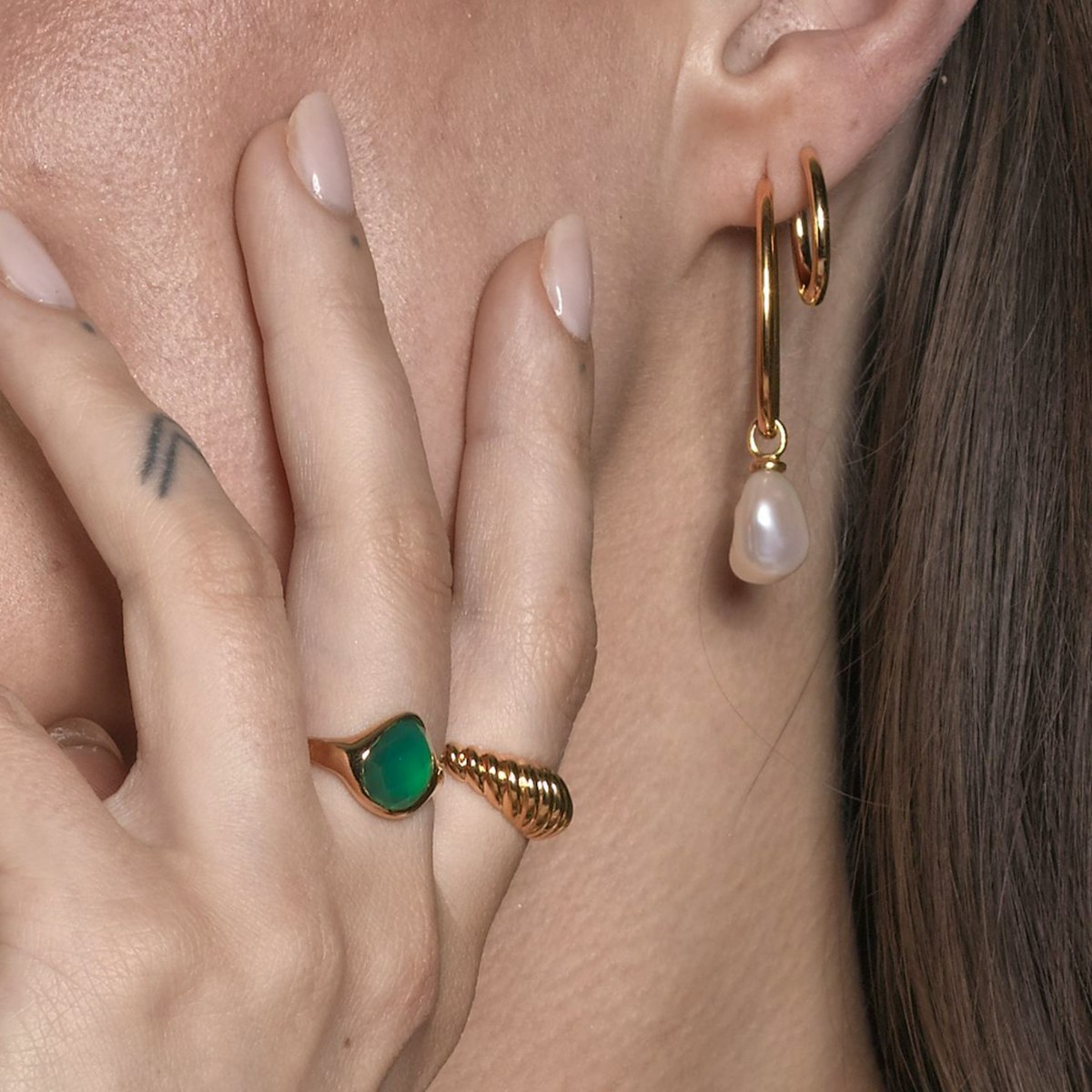 Athena Green Ring Large er laget av sterlingsølv av høy kvalitet og belagt med 18 karat gull som gir en varm glød og en slitesterk finish. Sølvet er 100 prosent resirkulert og ringen er nikkelfri, noe som gjør den skånsom mot huden og behagelig å ha på hele dagen. Smykket er tilgjengelig i størrelsene 50, 52, 54, 56 og 58, slik at du enkelt kan finne den perfekte passformen for deg.