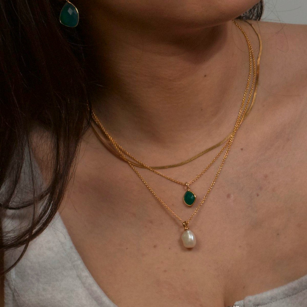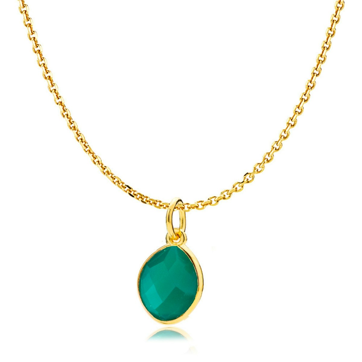 I sentrum av smykket står en vakker grønn onyx, som med sin dype, rike fargetone tilfører smykket en luksuriøs varme og dybde. Den fasetterte steinen er innfattet i 18 karat gullbelagt sterlingsølv, noe som skaper et elegant samspill mellom den kjølige grønne fargen og det gylne metallet. Resultatet er et harmonisk og stilfullt uttrykk som kan bæres alene for en minimalistisk look eller sammen med andre smykker for å skape en mer personlig og lagvis stil.