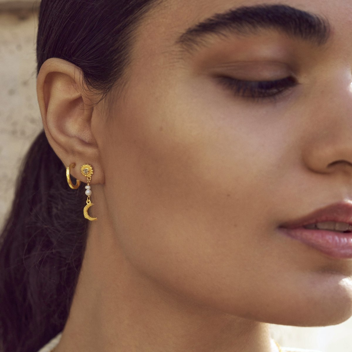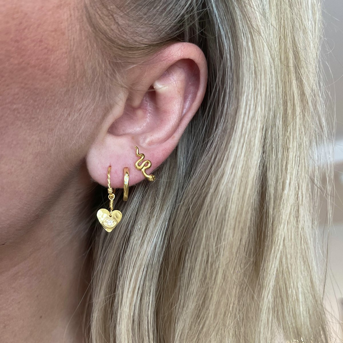 Et twistet design med skinnende zirkoner nyfortolker den klassiske hoop-ørering. Echo-øreringene findes i tre forskellige størrelser og er i Maanestens A/W 23-kollektion skabt som en hyldest til naturens organiske former, en af kollektionens store inspirationskilder