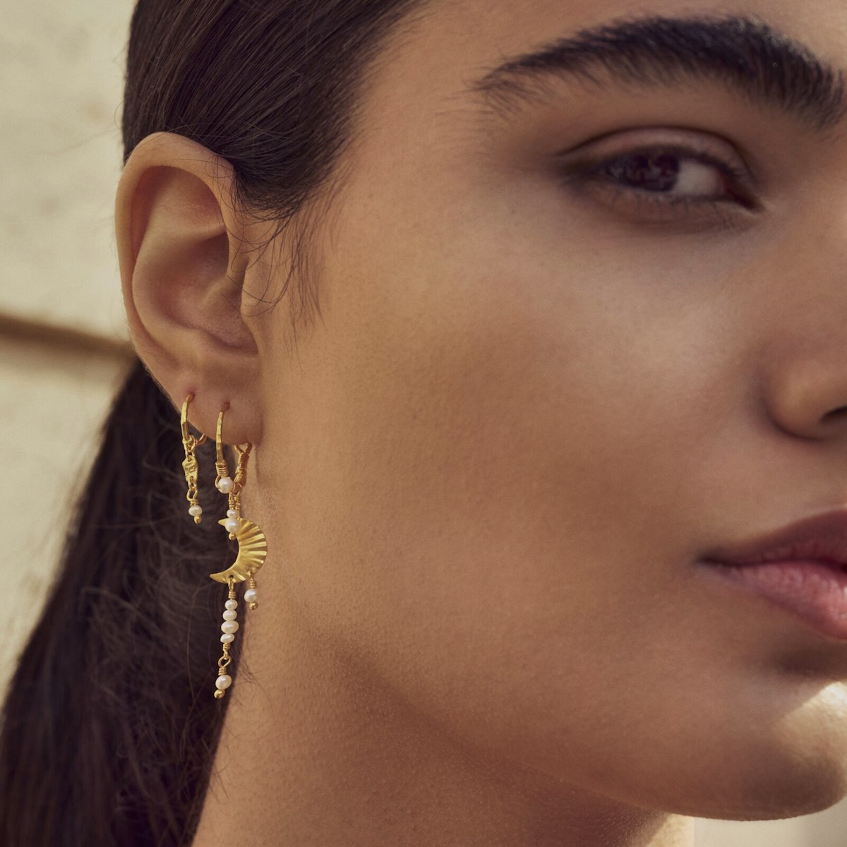 Esta Earrings fra Maanesten er en fortryllende hyldest til månen og dens mystiske skønhed. To strålende måner drypper med delikate ferskvandsperler, der hænger som frostdråber i natten og reflekterer lyset med en subtil glød. Månen har gennem tiden været et symbol på femininitet, intuition og skæbne, og i græsk mytologi forbindes den med gudinden Artemis, der repræsenterer styrke, frihed og indre visdom. Disse øreringe fanger denne energi og omsætter den til et smykke, der både er poetisk og tidløst.