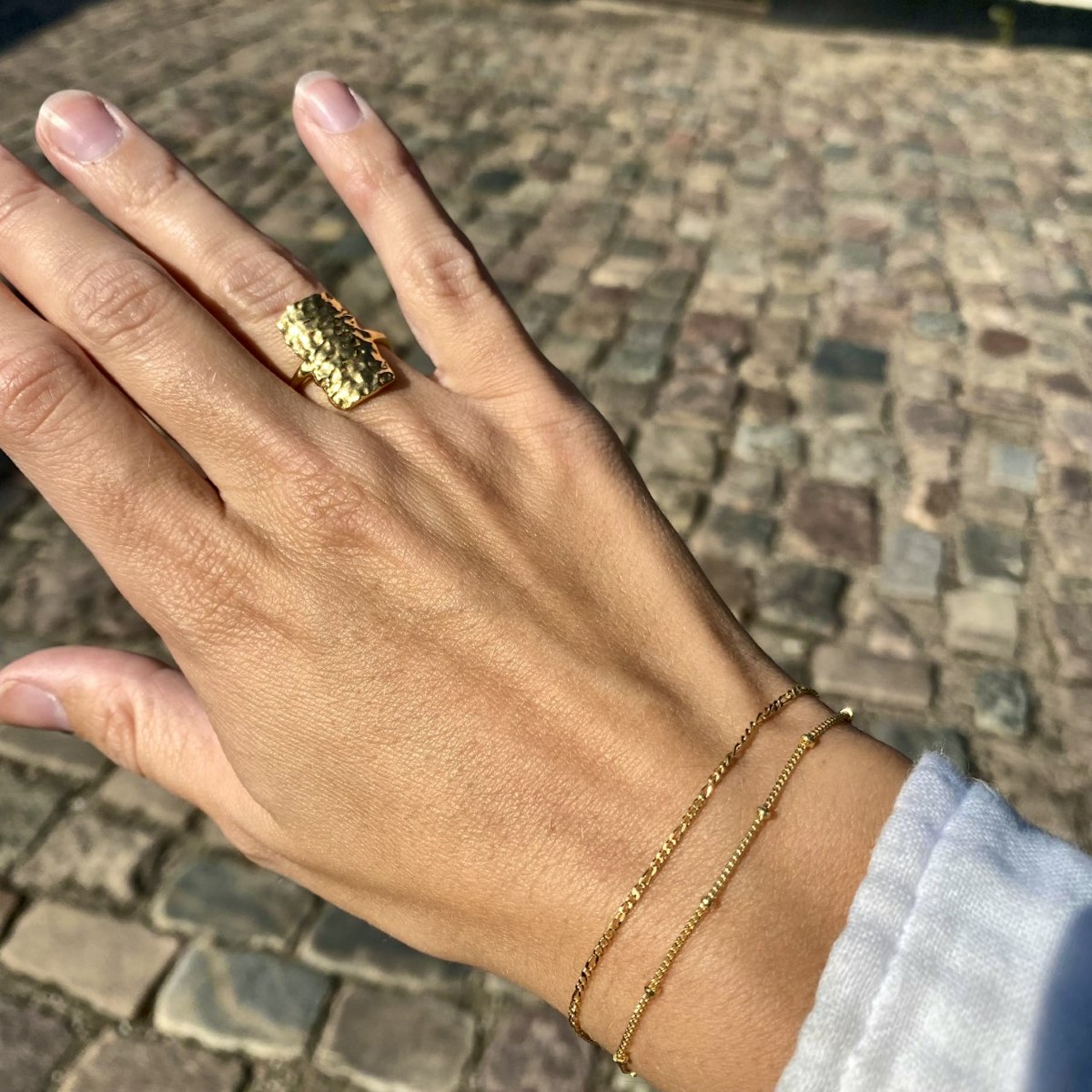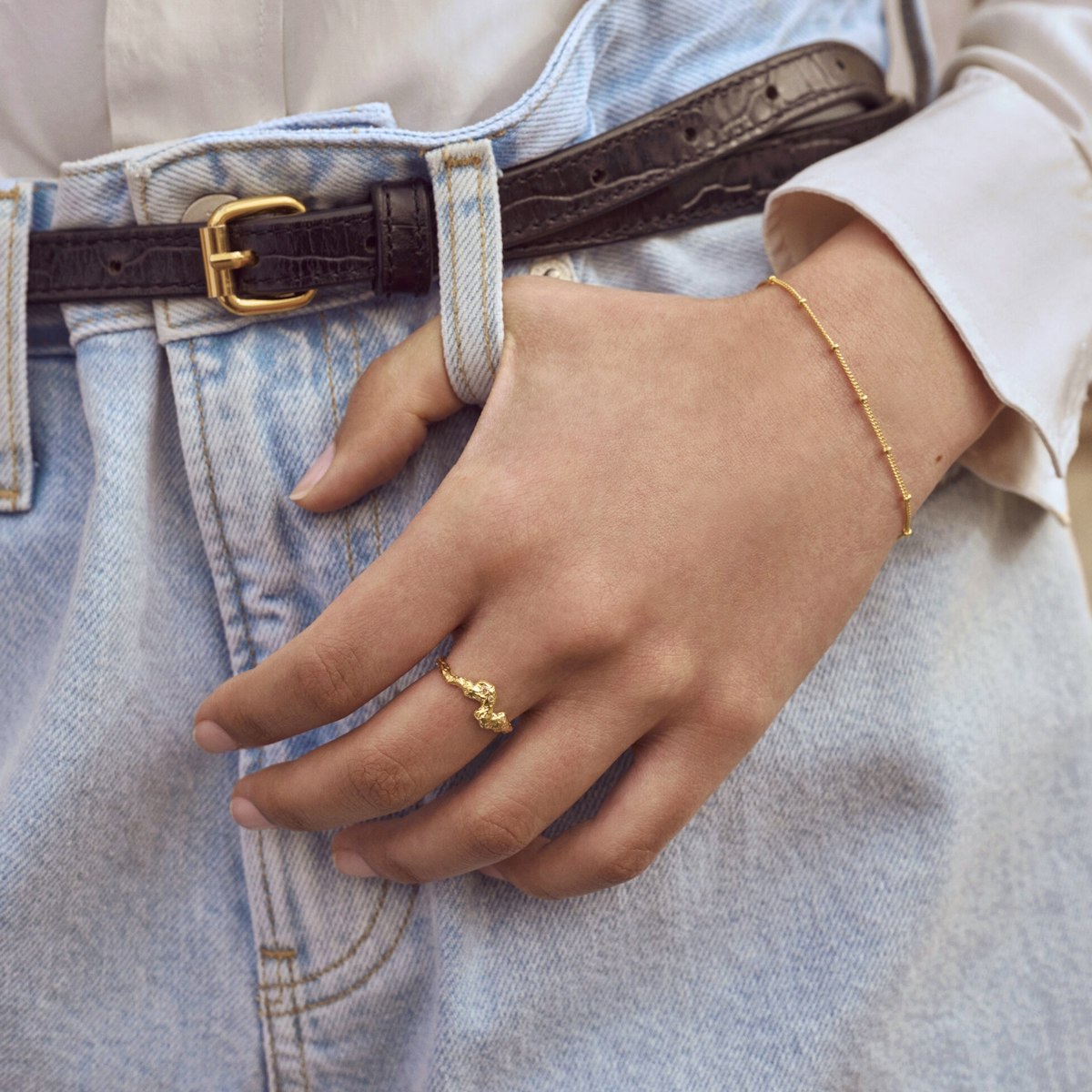 Her den smukke og meget populære Nala armbånd fra Maanesten. Den fine og enkle har små fine kugler, som er blank poleret i sterling sølv og belagt med 18 karat guld, som tilføjer et strejf af luksus til ethvert håndled. Det justerbare design gør det let at tilpasse til din personlige stil.
