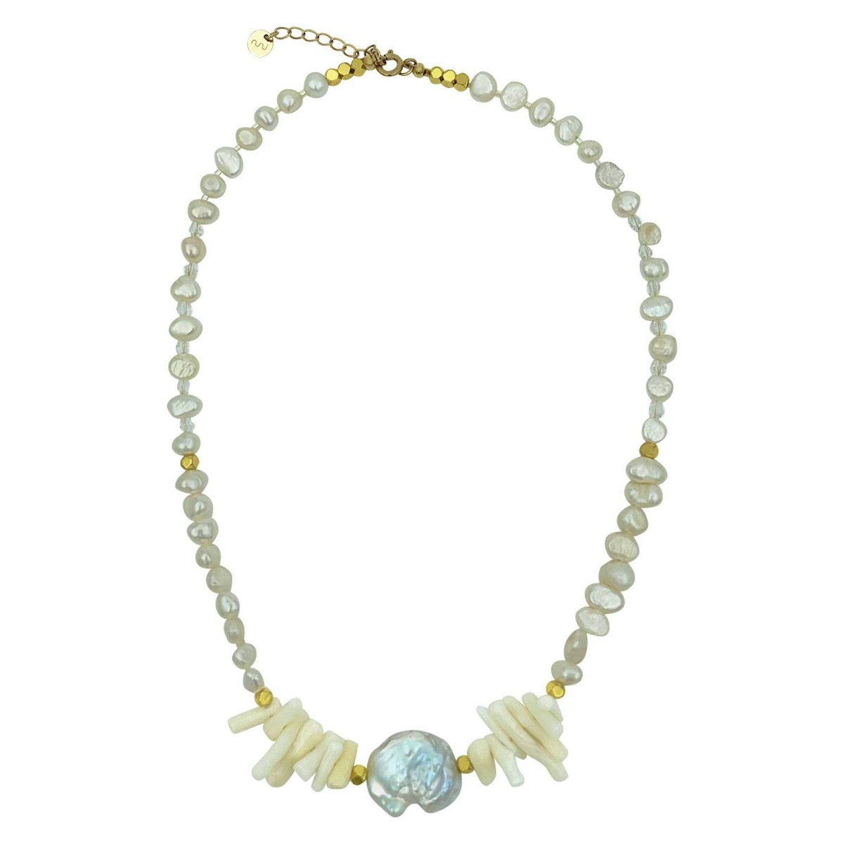 Designet kombinerer uensartede ferskvannsperler, glassperler og små gulldetaljer i 18 karat gullbelagt sterlingsølv - alt vakkert bundet sammen av en stor midtperle og "koralllignende" perler som gir halskjedet karakter og kant. Den hvite fargen gjør det utrolig enkelt å style - det passer til alt fra sommerkjoler og skjorter til strikk og blazere.