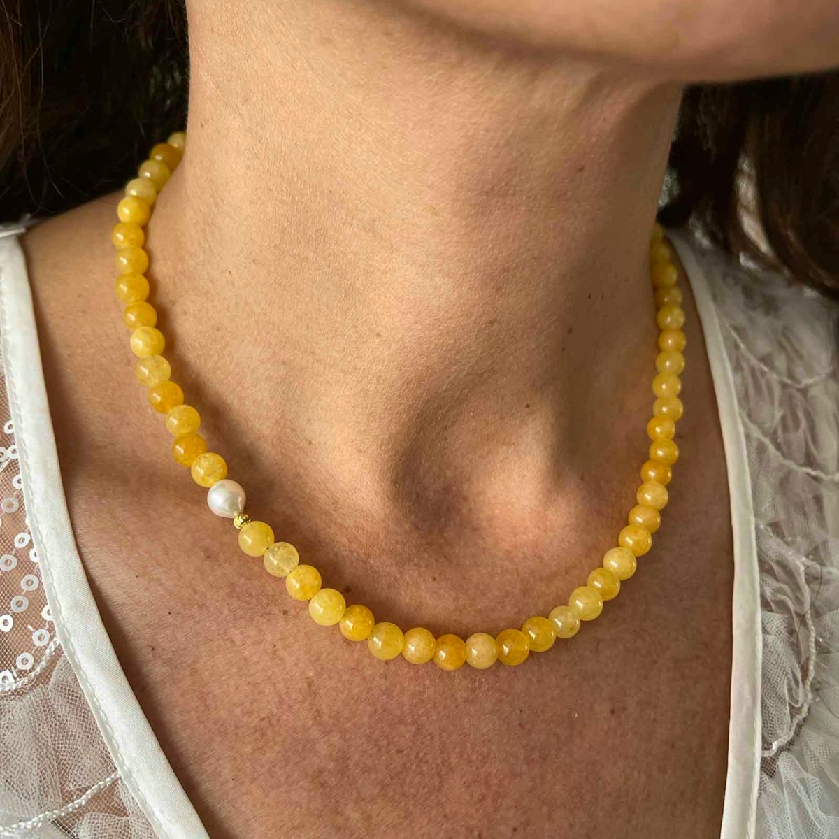 Florence Yellow Necklace er et elegant og fargerikt halskjede som kombinerer håndverk, kvalitet og et moderne, lekent uttrykk. Halskjedet er laget i 24 karat gullbelagt, resirkulert sterlingsølv 925 og består av varmt gulfargede jadesteiner som gir et friskt og solfylt uttrykk til smykkesamlingen din. En enkelt hvit ferskvannsperle er inkorporert i designet, noe som gir halskjedet en raffinert vri og en følelse av balanse.