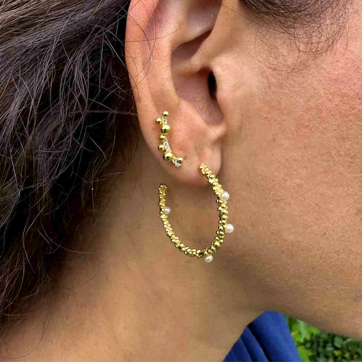 Disse vakre creolene er laget av 24 karat gullbelagt resirkulert sterlingsølv 925, noe som gir dem en fin, varm glød og sørger for at de holder seg vakre lenge. Ved å bruke resirkulert sølv får du ikke bare et smykke av superhøy kvalitet, men også et mer bærekraftig valg - det er smart! Det som virkelig gjør Gloria Large Pearl Earrings til noe helt spesielt, er de vakre, ekte ferskvannsperlene som elegant henger ned fra ringen. Perlene har en naturlig og unik glans som gir et mykt og feminint uttrykk. Med en diameter på 30 mm har disse creolene en imponerende størrelse som gjør dem til et diskret statement uten å være for tunge.