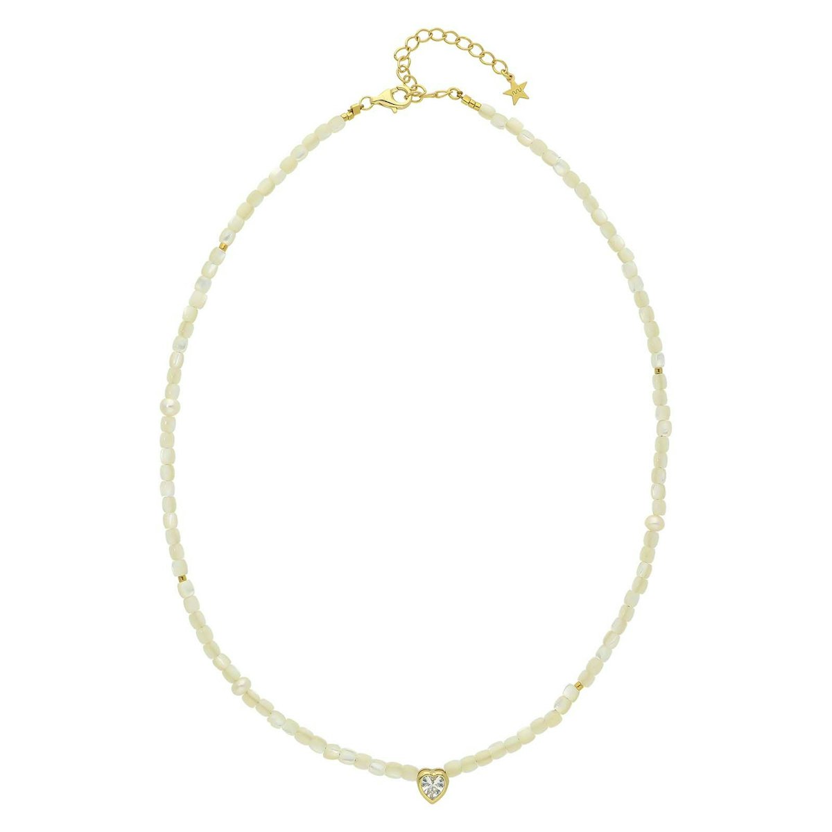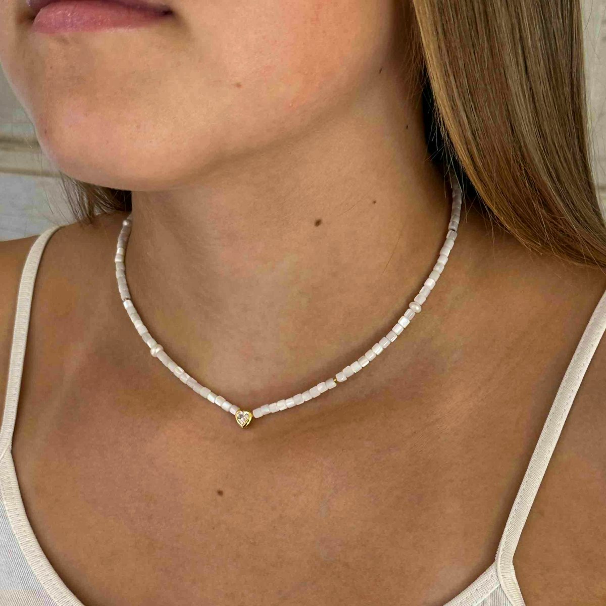 De små, myke perlene er lette mot huden og gir et naturlig og rolig uttrykk som passer til alt fra jeans og T-skjorte til favorittkjolen. I midten av det hele er det et lite hjerte med en glitrende zirkon - en stille påminnelse om kjærlighet, glede og alt som betyr noe.