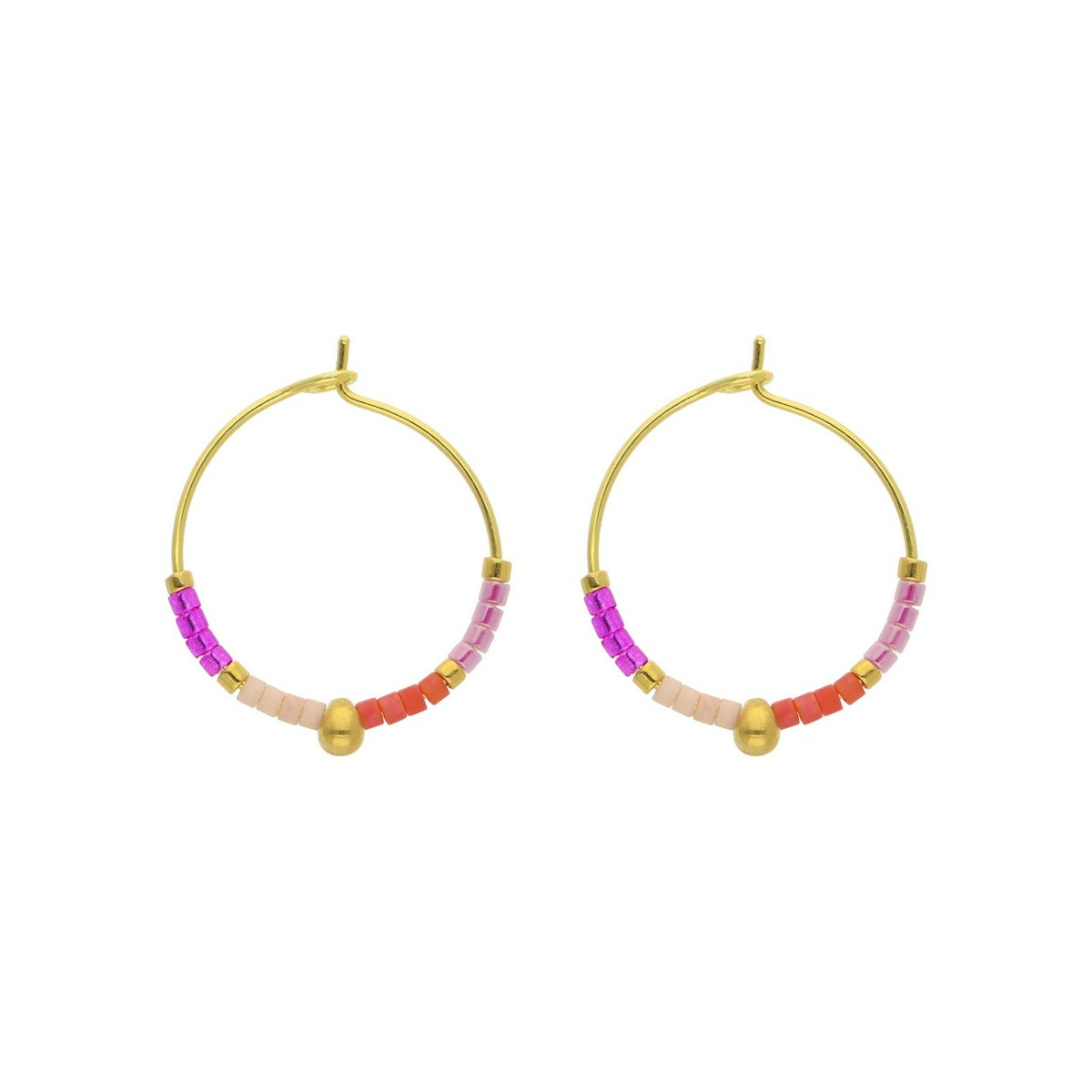 På de runde ringene er det små glassperler i de fineste nyanser; rosa, korall, fersken og et snev av gull - som til sammen skaper et varmt og glødende uttrykk. Dette er farger som utstråler sommer, energi og glede, men som også er dempet nok til å kunne brukes hele året. I midten av perlekjedet sitter en gyllen perle som binder det hele elegant sammen og tilfører en liten vri av eksklusivitet.