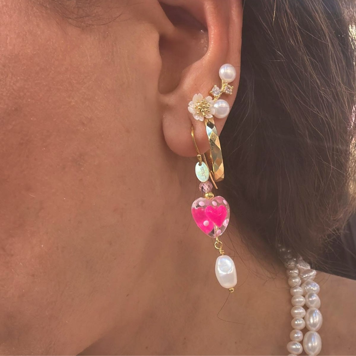 Med en lengde på 48 mm henger de vakkert fra øret og beveger seg elegant med deg. De er enkle å ha på, men gir likevel et slående inntrykk. Det fargerike designet og hjerteformen gjør dem ideelle til å understreke en personlig og kreativ stil eller som et statement-piece til et enklere antrekk. Tenk deg dem til en sommerkjole, en hvit skjortelook eller en romantisk date - de fungerer i mange sammenhenger og tilfører noe helt spesielt.