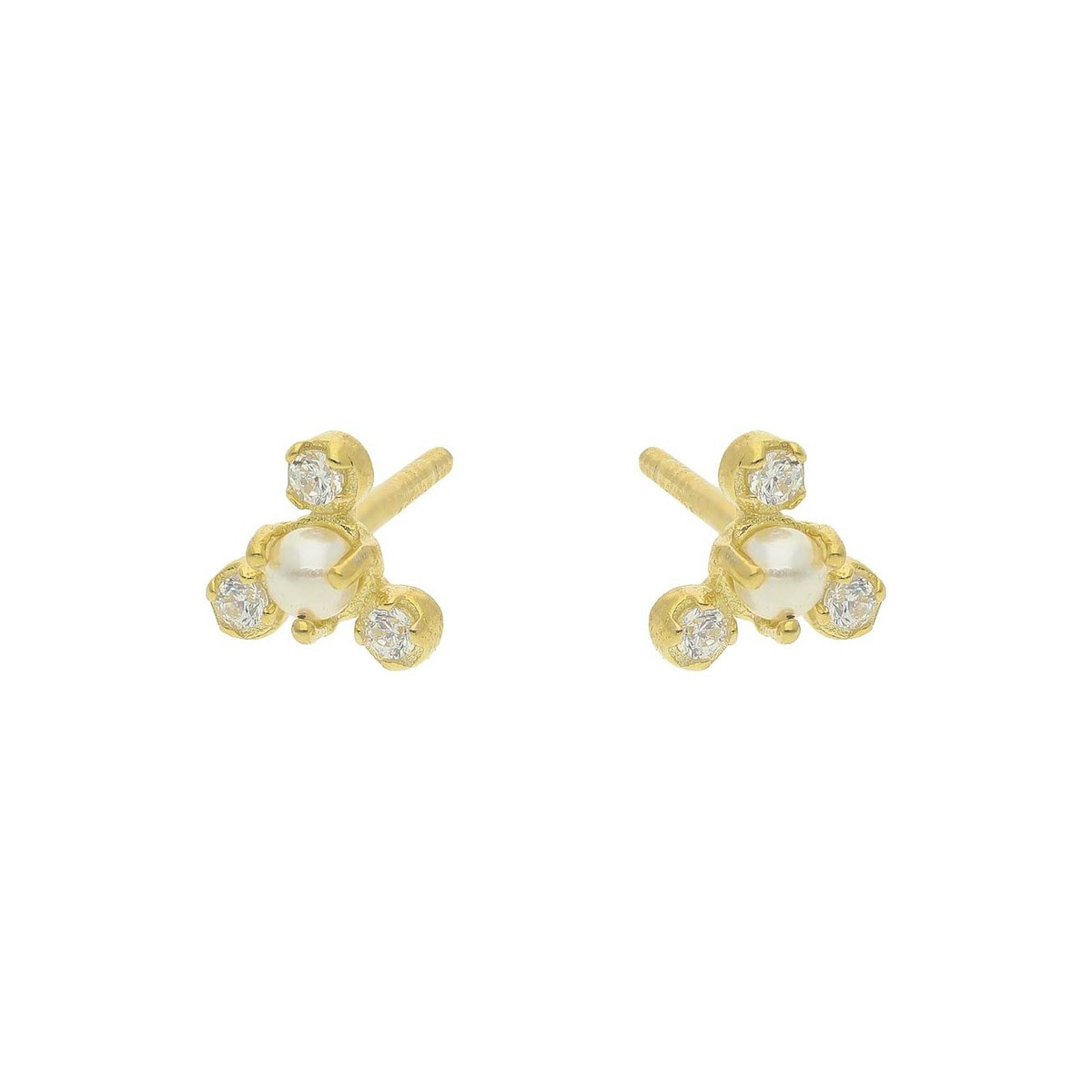 Scarlett Earsticks er et sett med delikate og feminine ørestikker som utstråler ynde og diskré luksus. De er laget av 24 karat gullbelagt resirkulert sterlingsølv, noe som gir dem en varm og klassisk glød samtidig som det er et mer bærekraftig valg. I midten av hver ørestikker er det en liten ekte ferskvannsperle omgitt av tre klare zirkonia-stener som fanger lyset og tilfører et streif av subtil glitter.