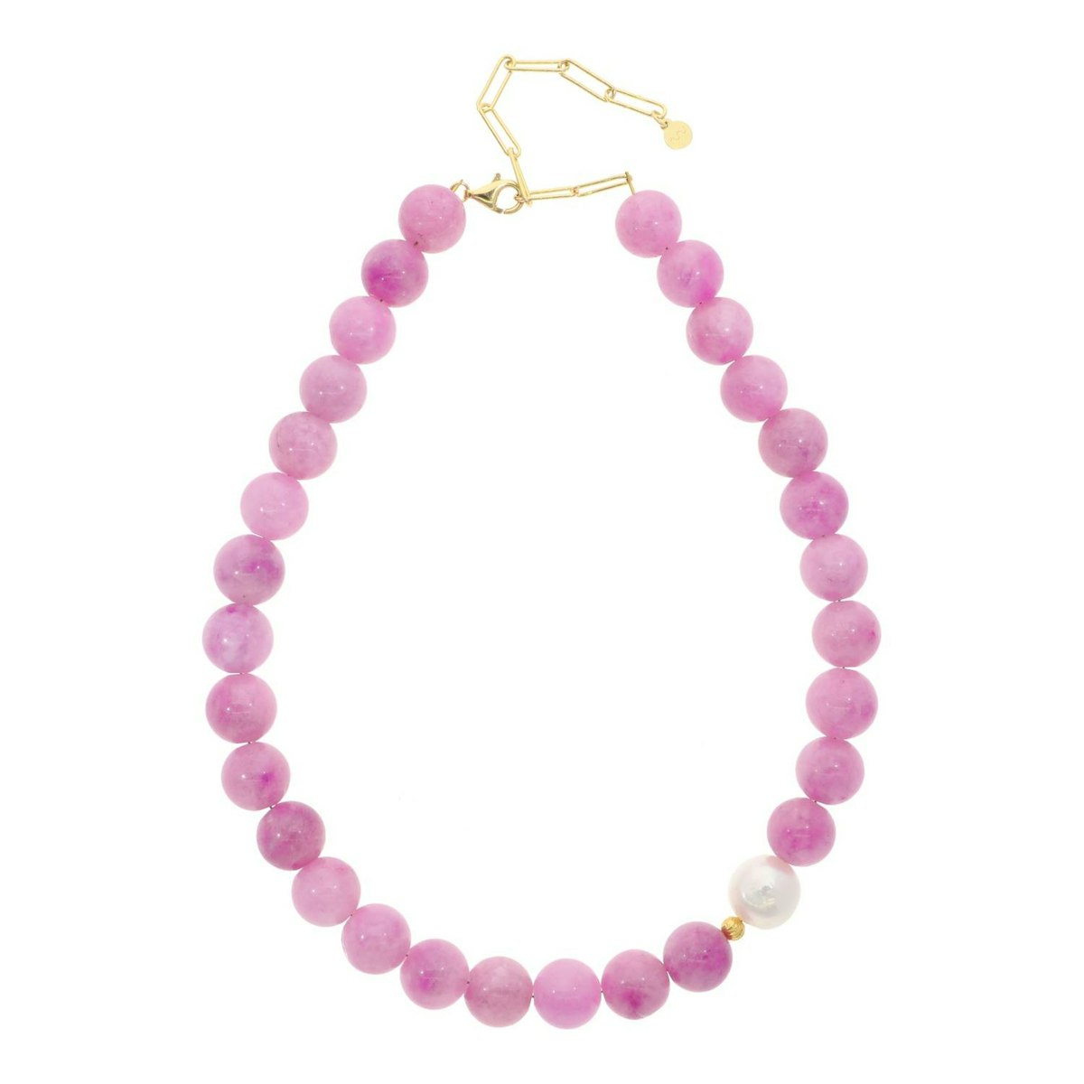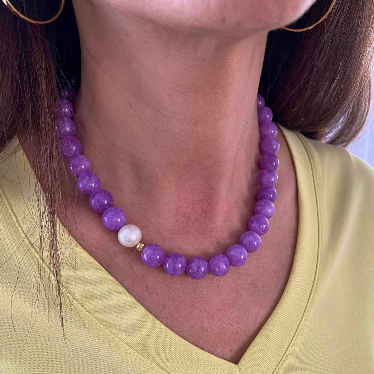 Halskjedet er håndlaget med sans for detaljer og kvalitet. De ensartede, runde perlene i sart lavendellilla gir smykket et harmonisk og rolig uttrykk, mens en ferskvannsperle tilfører et organisk element som bryter rytmen og gir liv til designet. Den diskrete fargekombinasjonen gjør halskjedet utrolig allsidig - perfekt til både hverdag og fest.