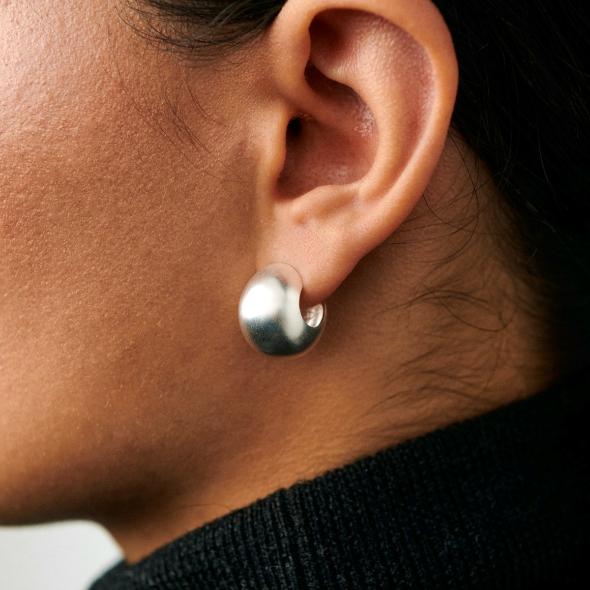 Echo Hoops er laget med en kjerne av 95 % resirkulert messing, belagt med sertifisert resirkulert sterlingsølv eller 18 karat gull, og tilbyr både en robust konstruksjon og et eksklusivt ytre. Velg mellom en sølv- eller gullbelagt variant, avhengig av stil og smykkesamling.