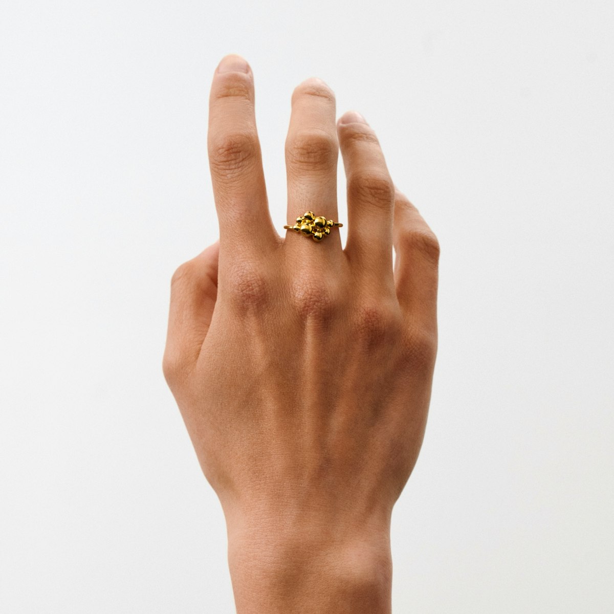 Pebble Ring fra Pernille Corydon er et vakkert eksempel på hvordan enkelhet og naturinspirasjon kan kombineres i et tidløst design. Ringen er inspirert av møtet mellom sollyset og de små, glitrende steinene på de danske strendene. Den består av syv små "steiner" i edelt metall som er arrangert i et organisk mønster, i størrelser fra 2 mm til 7 mm. Dette skaper et levende uttrykk der den blanke overflaten reflekterer lyset på en måte som fremhever de myke formene.
