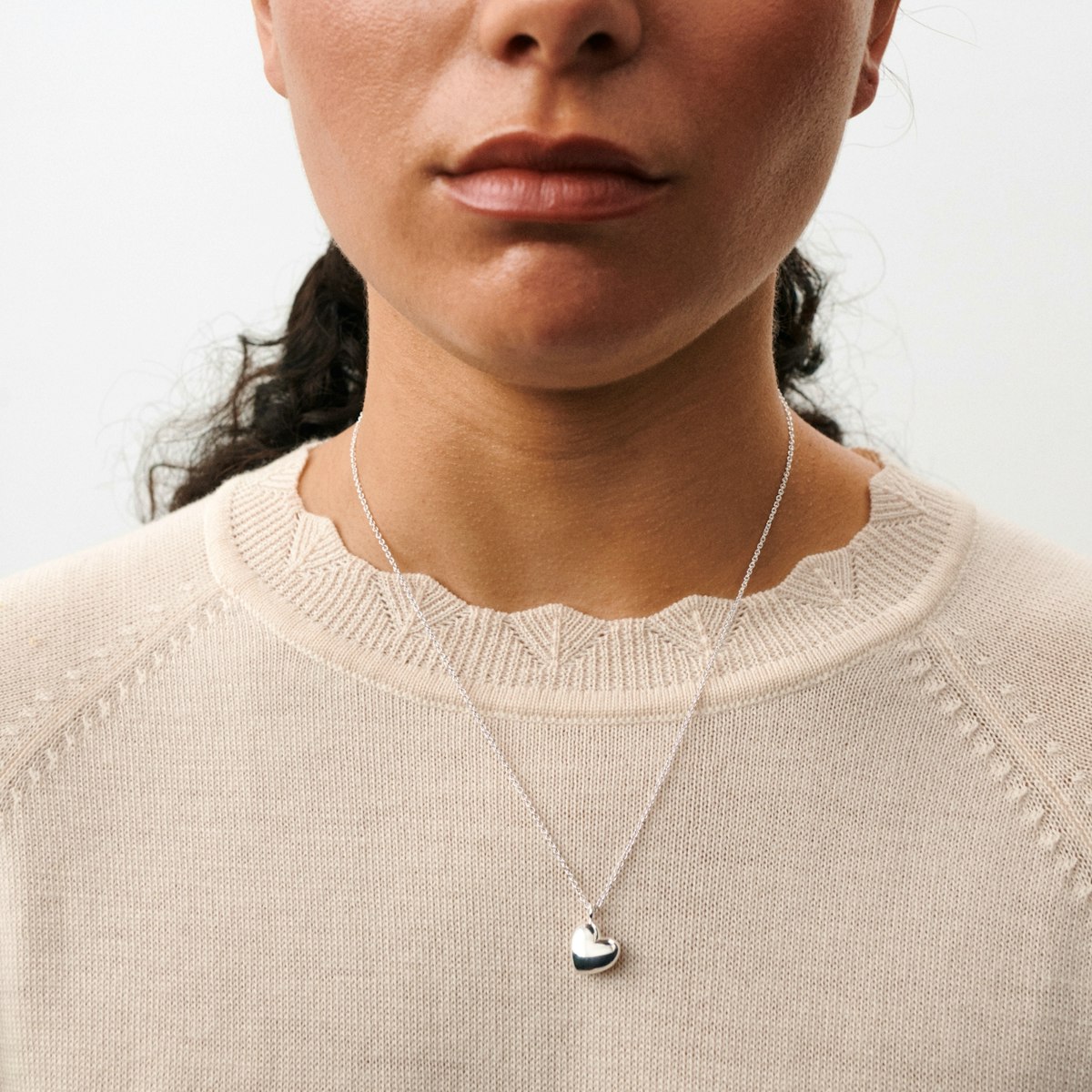 Sweetheart-halskjedet er et romantisk og feminint smykke som kombinerer enkel eleganse med et varmt og personlig uttrykk. Det vakre hjerteformede anhenget har et chunky design som gir halskjedet karakter samtidig som det har en myk og innbydende form. Med det justerbare kjedet kan halskjedet bæres tett rundt halsen for et klassisk uttrykk eller litt lengre for en mer avslappet look. Denne fleksibiliteten gjør det enkelt å style halskjedet alene eller kombinere det med andre kjeder for å skape en personlig lag-på-lag-look.
