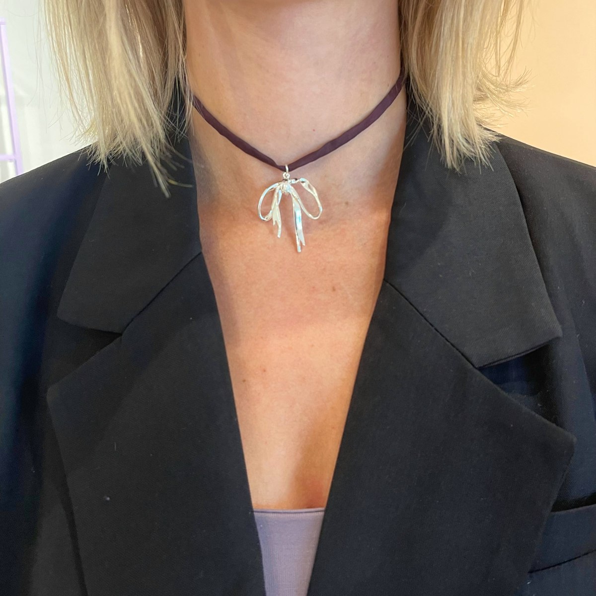 Halskjedet har et bånd i fargen 'Aubergine' og en vakker sløyfe i sølvbelagt messing. Satengsnoren har en lengde på 67 cm og sløyfen er 20 x 20 cm.