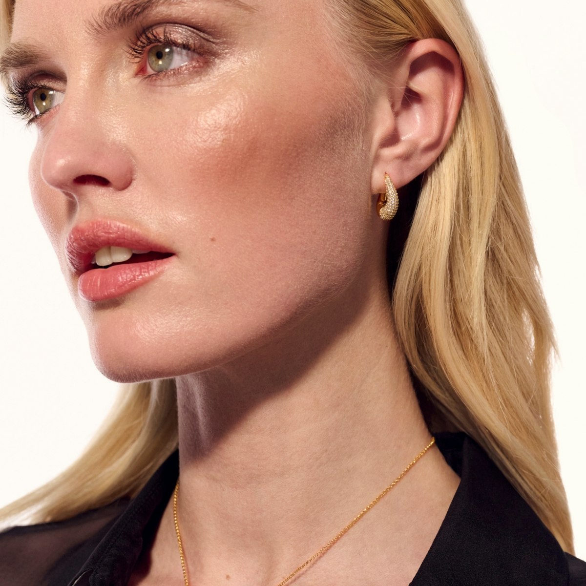 Disse vakre øredobbene kommer i to versjoner: én i 18 karat gullbelagt 925 sterlingsølv med blank overflate og håndfattede fasettslipte hvite zirkoniaer, og én i 925 rhodiumbelagt sterlingsølv med blank overflate og håndfattede fasettslipte hvite zirkoniaer. Begge versjonene utstråler tidløs eleganse og er perfekte til å sette et sofistikert preg på ethvert antrekk. Øredobbene måler 18 mm i lengden og 7,7 mm i bredden, noe som gjør dem ideelle til både hverdag og fest.