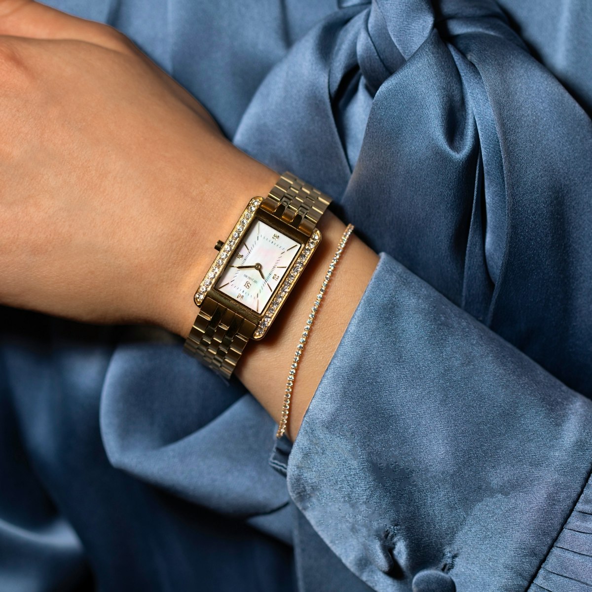 Dette elegante uret er laget i gullbelagt rustfritt stål som kombinerer en polert og børstet overflate for et sofistikert utseende. Klokken har et krystallklart safirglass, en urskive i perlemor og er vakkert innrammet med hvite sirkoner som gir et subtilt, men luksuriøst preg.