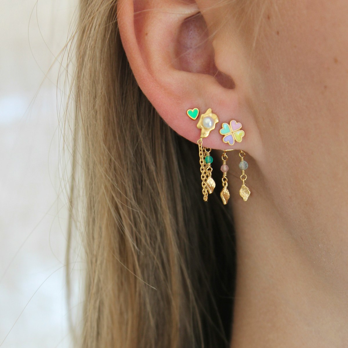Fin lille kløver-ørestik lavet af fire hjerter med emalje i fire smykke farver, der komplimenterer hinanden skønt.