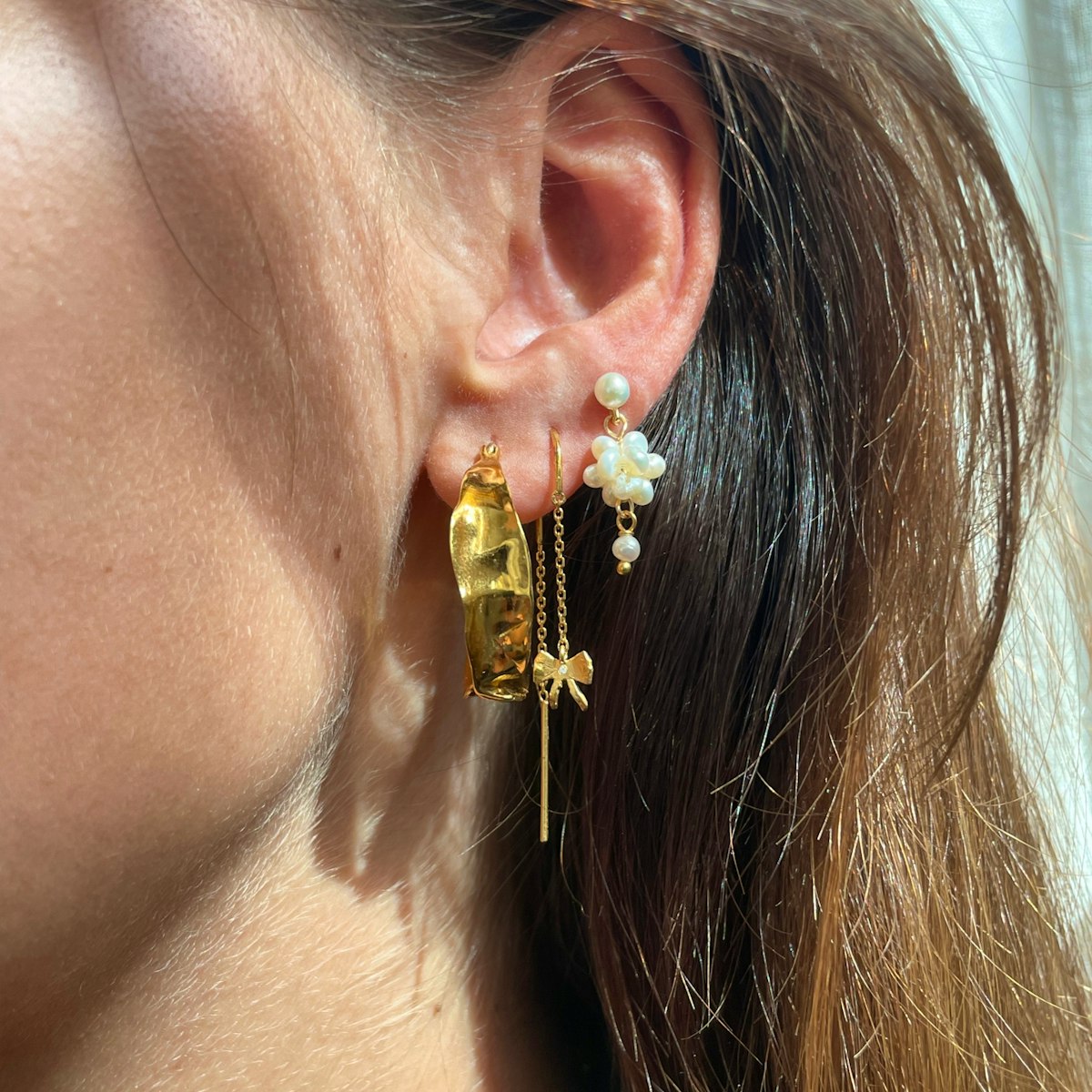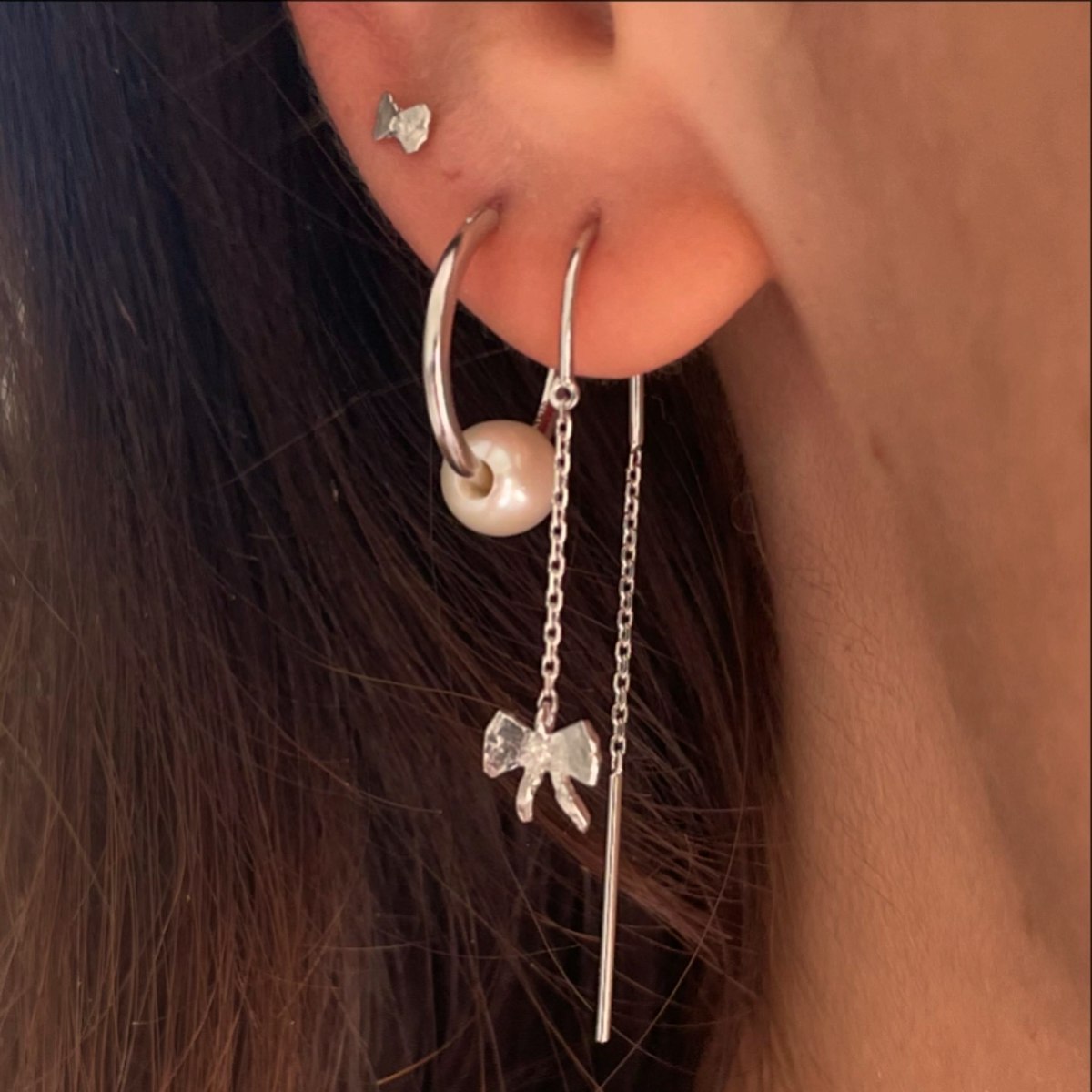 Den forreste kæde, som måler 3 cm, er prydet med en lille, udsøgt sløjfe, der tilfører en feminin og elegant detalje til det overordnede design. Sløjfen fanger lyset på en fortryllende måde og fremhæver den fine struktur af øreringen.