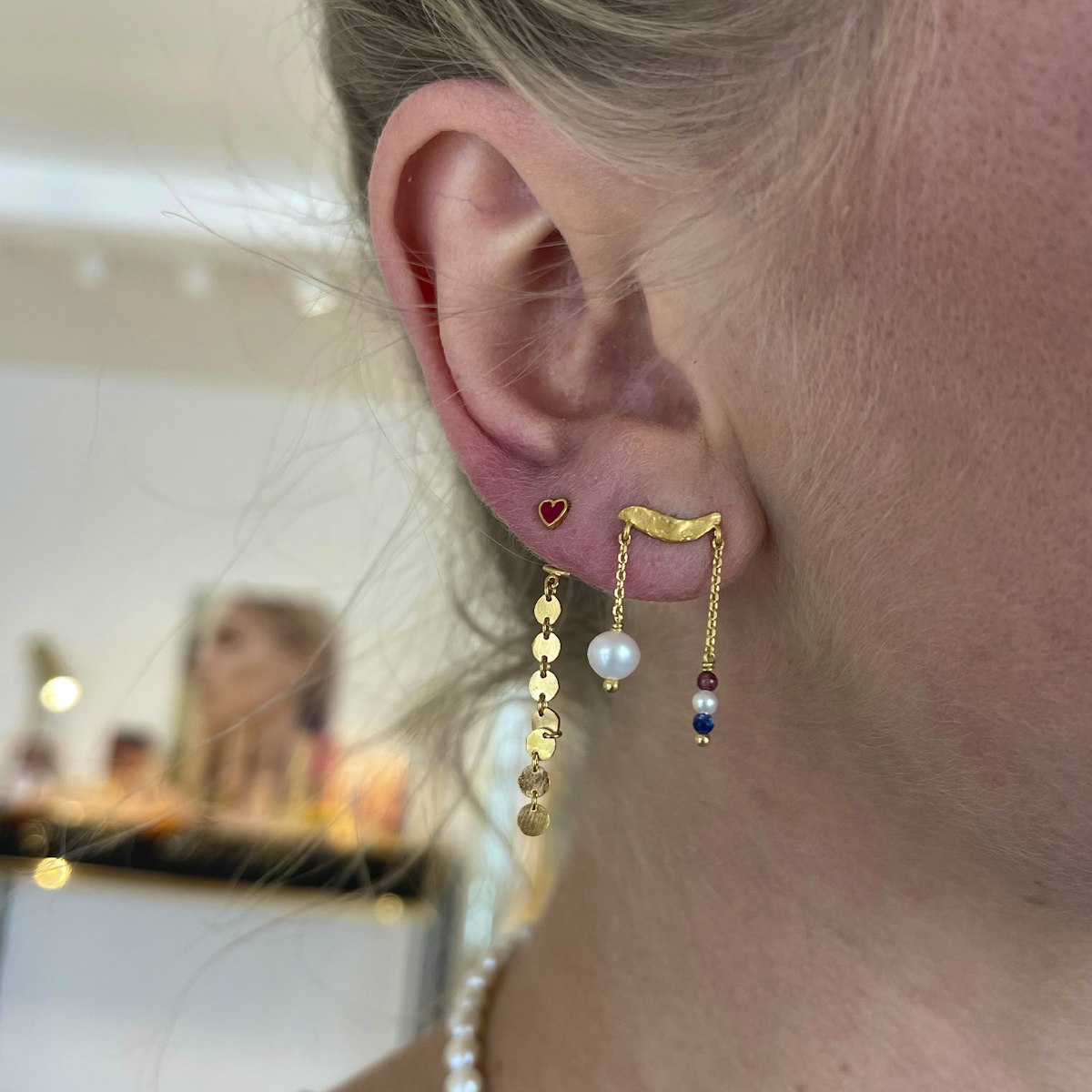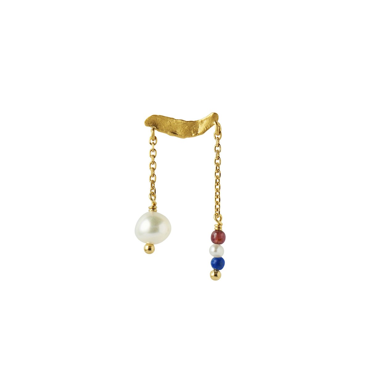 Fremhæv din unikke stil med vores sensationelle Stine A ørestik! Denne enestående ørering kombinerer en organisk form med en eksklusiv blanding af dansende kæder, der prydes af smukke ferskvandsperler og ædelstene.