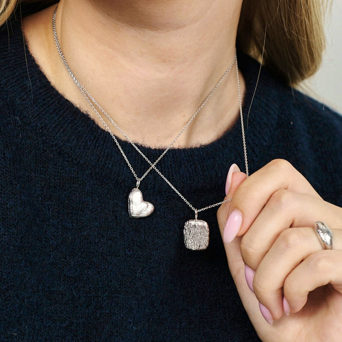 Det håndlagde anhenget er formet som et hjerte med en rå og organisk overflate som gjenspeiler naturens uperfekte skjønnhet. Hjertet åpner seg forsiktig for å avsløre et lite rom, perfekt for å bære noe verdifullt. Det kan være et bilde, en liten beskjed eller kanskje bare en hemmelig tanke. Denne funksjonen gjør halskjedet til mye mer enn bare et smykke; det blir et personlig minne, laget for å bæres tett inntil kropp og sjel.