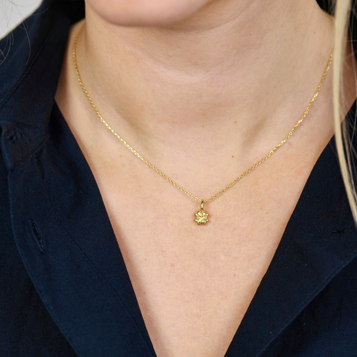 Det elegante kløveranhenget er laget med fokus på håndverksmessige detaljer, der hver bladoverflate har en subtil tekstur som reflekterer lyset på en naturlig og levende måte. Disse detaljene gir smykket en organisk følelse som tilfører varme og autentisitet til det minimalistiske designet. Kombinasjonen av det myke formspråket og det rene kjedet skaper en harmonisk balanse som gjør halskjedet egnet til både hverdagsbruk og spesielle anledninger.